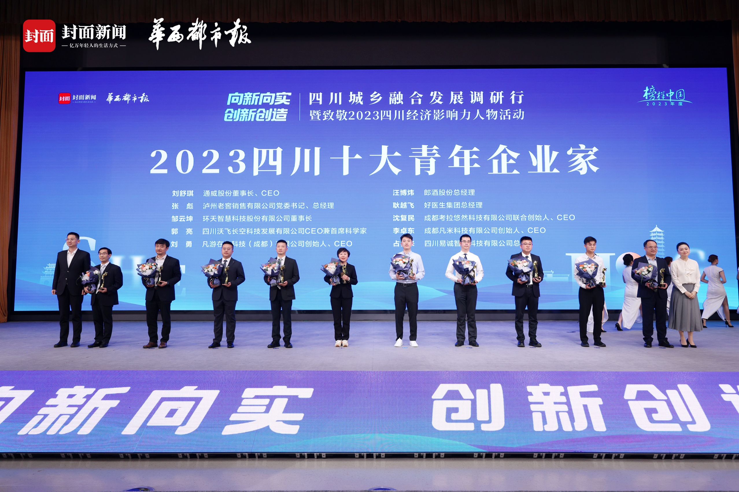 4月19日,由封面新闻、华西齐市报主理的“四川城乡交融发展调研行暨致意2023四川经济影响力东说念主物活动”在遂宁射洪举行,邹云坤摘得“2023四川十大后生企业家”名称。