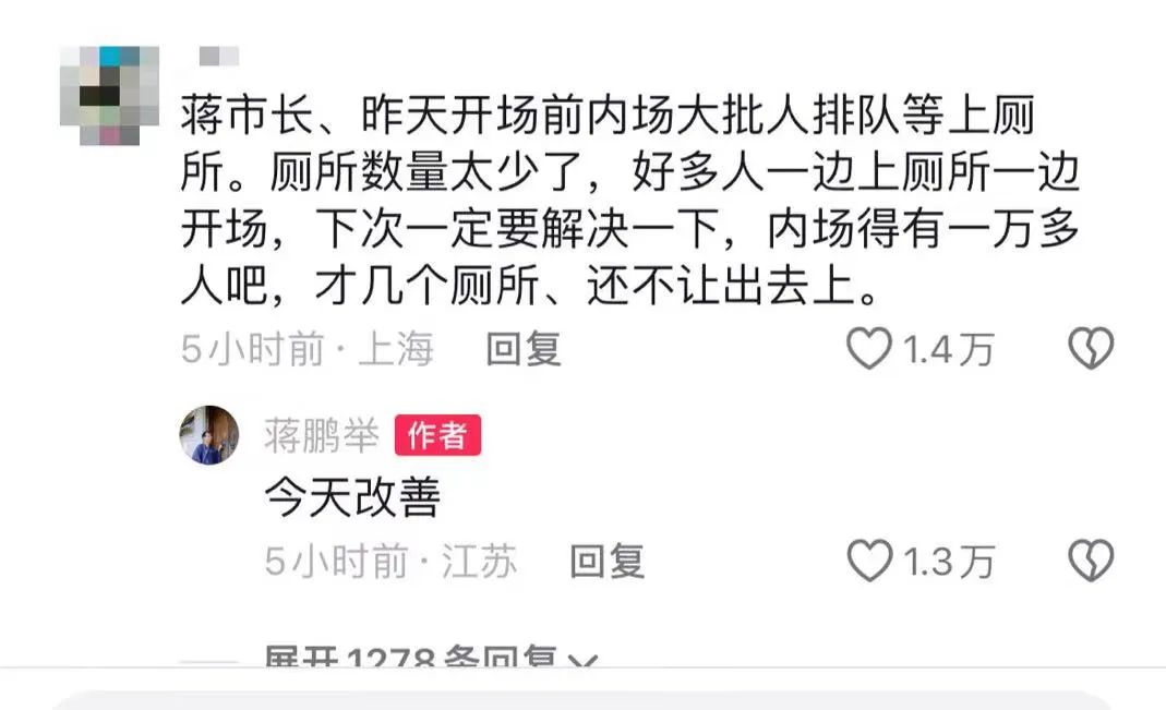 有网友反应,20日开场前内场好多东谈主列队等上茅厕,吐槽茅厕太少,建议“下次一定要惩处”。蒋鹏举复兴“今天(21日)改善”。