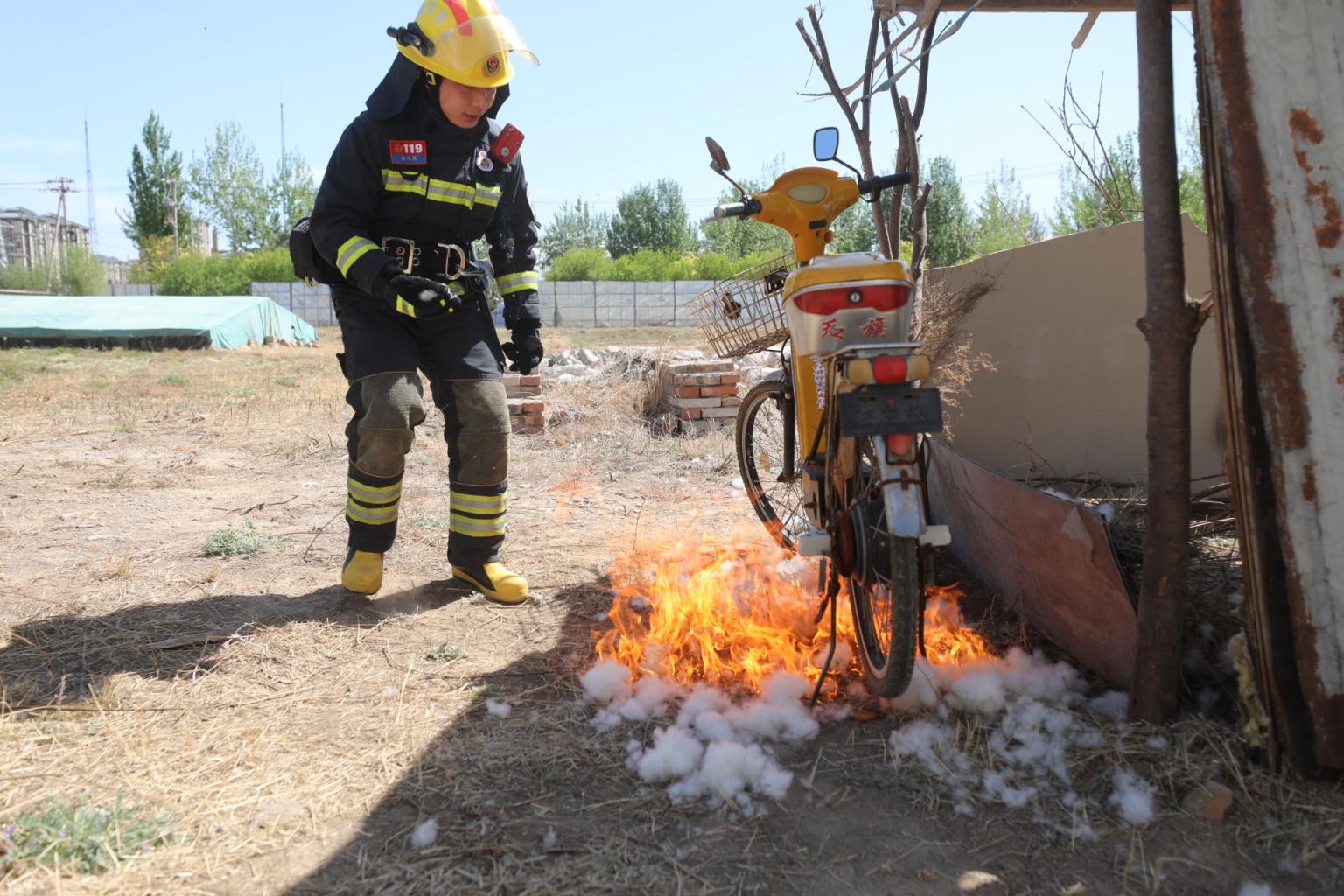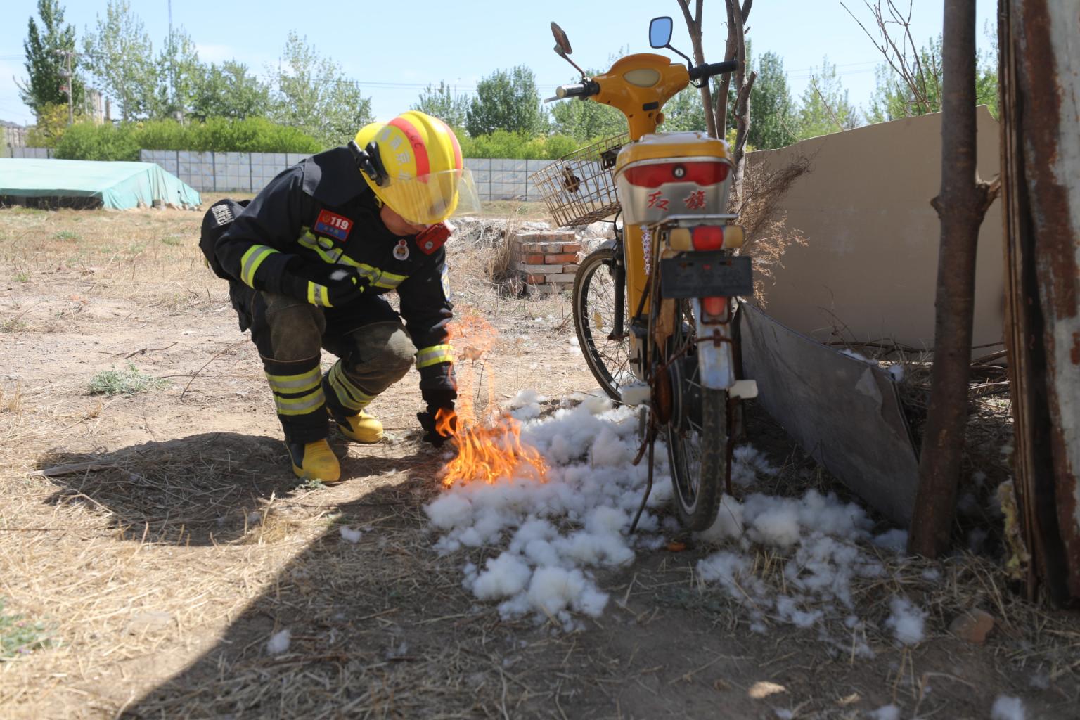 今天上昼的实验安排在大兴区魏善庄消防解救站左右的空旷瘠土,一辆消防车和几名消防员严阵以待,水带铺设至实验时势边,随时出水,以防不测。实验模拟杨柳絮长技术堆积不计帐,且摆布有杂草、枯枝等可燃物的情况,并将一辆电动自行车摈弃左右——这亦然本质生涯一些疏于惩处的泊车棚的神志。
