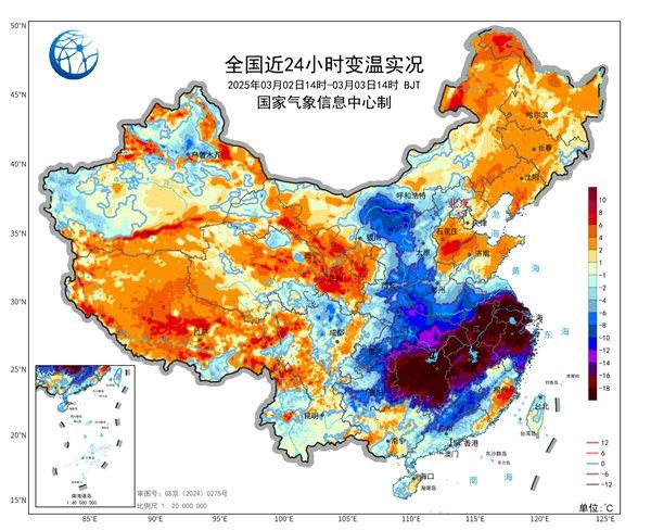 寒潮的到来径直击溃了南边的夏季“泡沫”。今寰宇午的24小时变温实况图上,长江中下流地区成为降温最横蛮区域,从昨天的接近或达到30℃的最高气温沿途倒降于今天的个位数,大片区域气温降幅广泛超20℃!