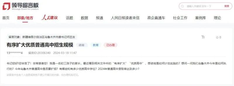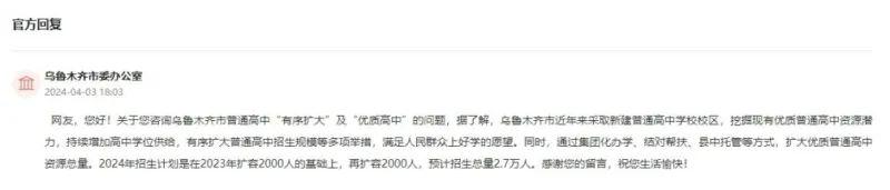 日前,一位来自乌鲁木皆市的网友在“指令留言板”上留言:我是又名初三孩子的家长,最近看到有关文献中对于时常高中“有序扩大”和“优质高中”的表述,思商量是若何实施的?乌鲁木皆若何扩充?本年乌鲁木皆时常高中是否要扩招?有哪些和有若干优质高中学位?2024年时常高中登科率达到若干?