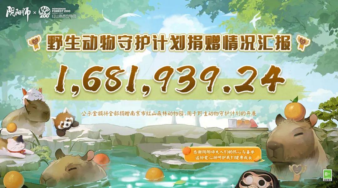 经寮办统计核算,在本次野活泼物公益活动中,阴阳师大东说念主们一共孝敬了爱心爪印1636599枚。经寮办核算渠说念用度和税费后,试验公益金额达1,521,939.24 元。寮办将以合座阴阳师大东说念主的步地,将全部试验公益金额捐馈遗南京市红山丛林动物园~